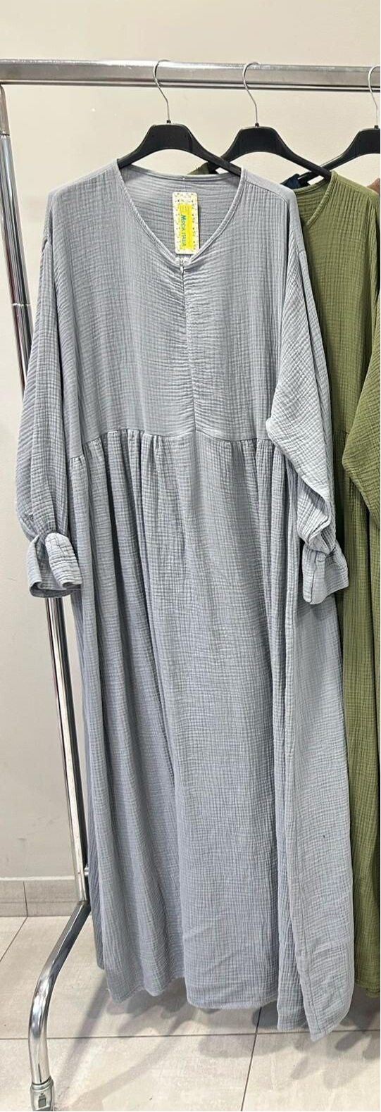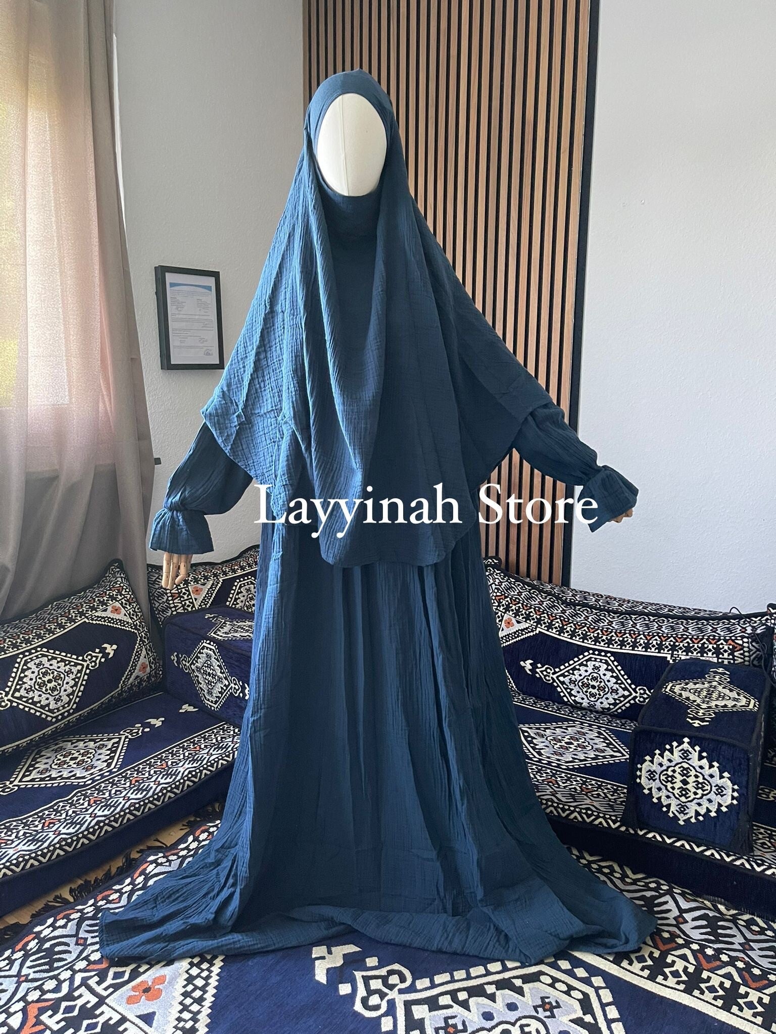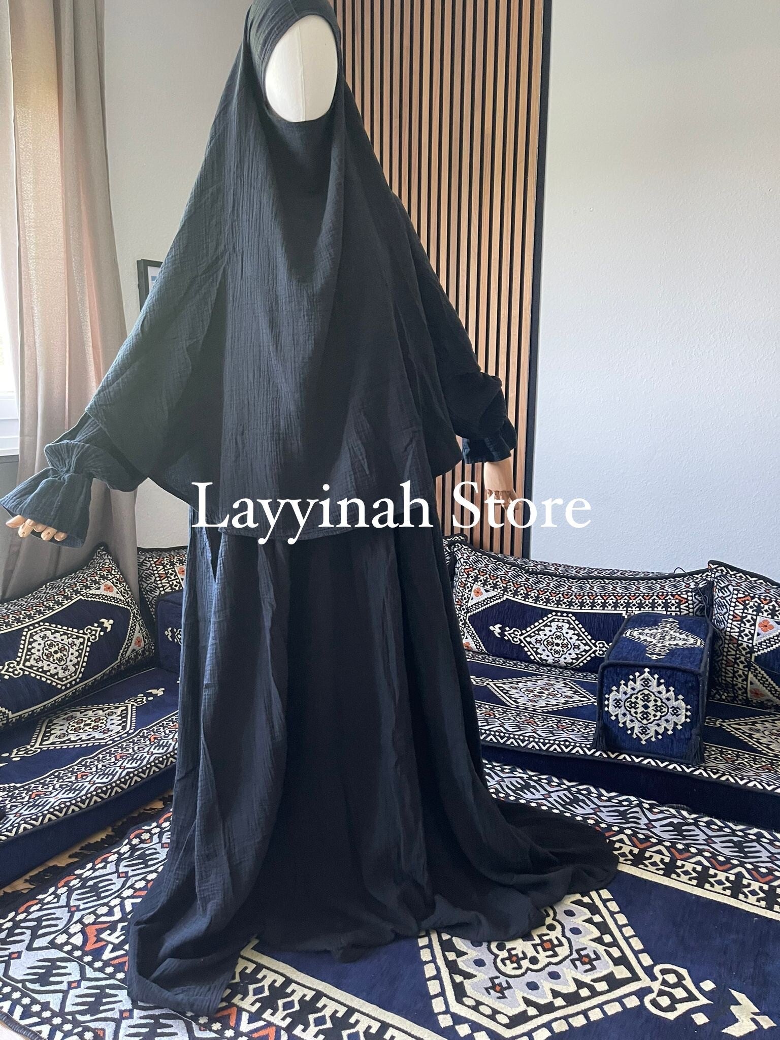 Dieses traumhaft leichte Set besteht aus einer luftigen Baumwoll-Abaya (ca. 160 cm lang) und einem farblich abgestimmten Khimar – ideal für warme Sommertage.